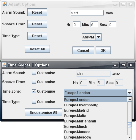 - You can set your own alarm sound (wave file), time zone, snooze time and time type (AM/PM or 24H) for each time keeper!